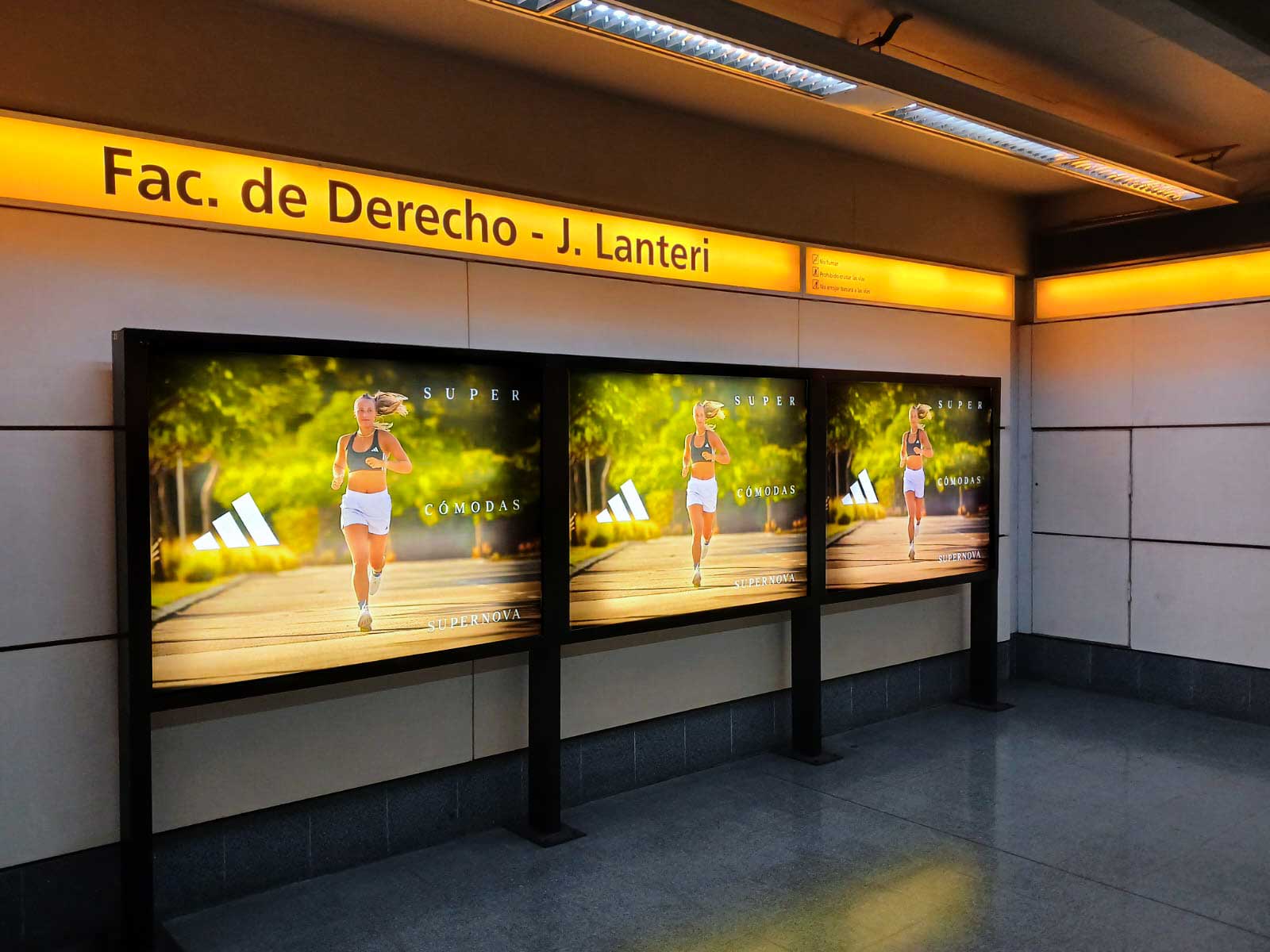 Territorio de marca compuesto por 3 soportes transiluminados unificados con marcos ploteados en andenes y vestíbulos de las principales estaciones de la Red. Puede complementarse con ploteo de piso.